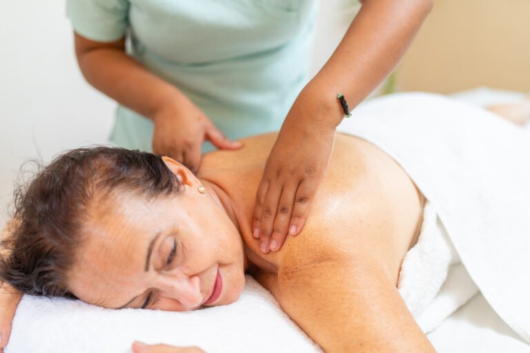 Massagem suave para idosos, aliviando dores musculares e articulares, promovendo conforto e bem-estar diário.