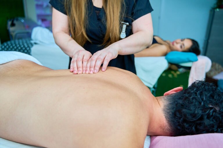 Massagem focada em costas, ombros e pescoço, aliviando tensões musculares e proporcionando relaxamento imediato e conforto.