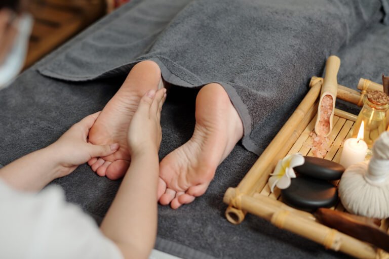 Massagem nos pés baseada na reflexologia podal, ajudando a equilibrar energia, reduzir tensões e estimular a circulação.